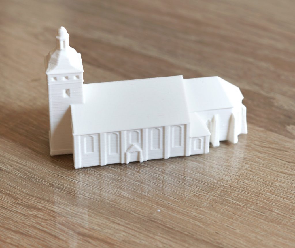 Eine weitere Anwendung dieser digitalen 3D-Modelle ist das Erstellen von realen Objekten. Mittels 3D-Druck werden digitalen Daten in die reale Welt übertragen. Mit einem 3D gedruckten Modell sind Sie in der Lage, ein digitales Objekt mit Ihren eigenen Händen zu ertasten. Im Folgenden sehen Sie die digitale Version der St. Martinikirche in Greußen, welche für den 3D-Druck verwendet wird.